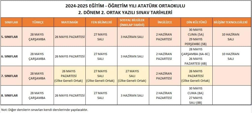2024-2025 Eğitim - Öğretim Yılı 2. Dönem 2. Yazılı Tarihleri aşağıdaki tabloda verilmiştir.